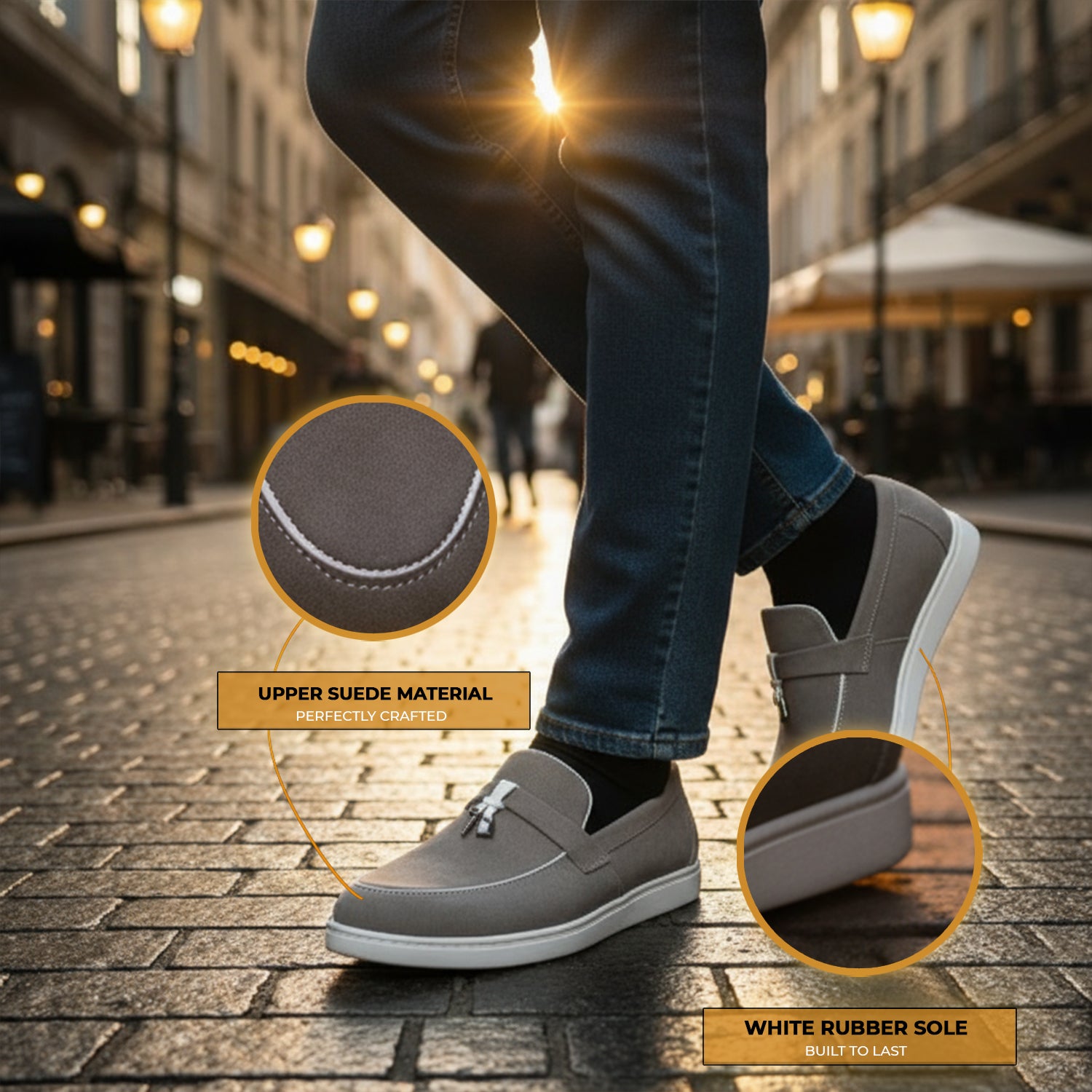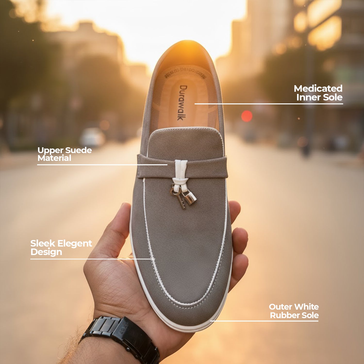 Elevate your style with our stylish Grey craft suede loafer shoes. Crafted for all-day comfort, they have a premium suede upper and soft leather lining for an exceptional finish and foot care. A lightweight white sole brings a touch of modernity. These loafers are perfect for casual and formal events, blending elegance with a relaxed aesthetic effortlessly. The flexible and lightweight rubber outsole offers outstanding durability on various surfaces while maintaining a secure grip.